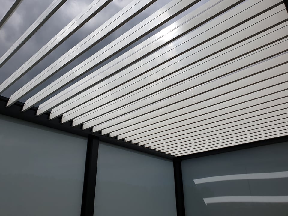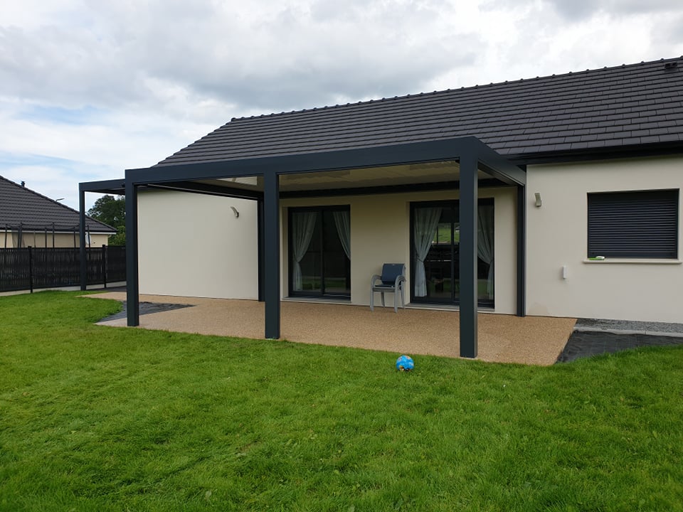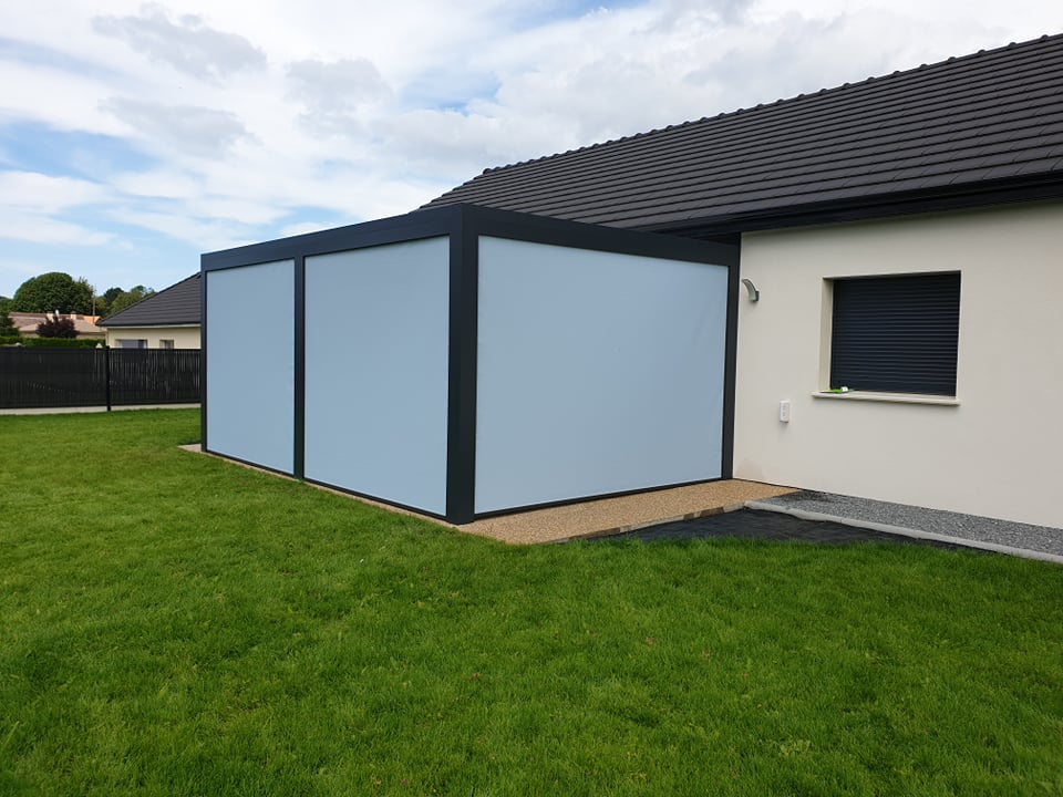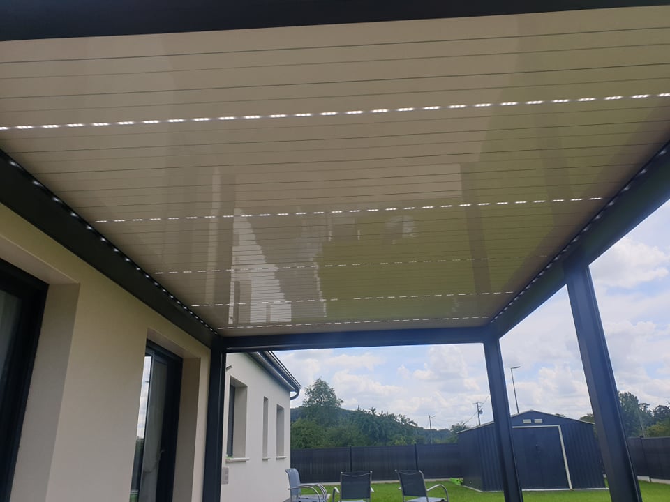 Pergola OPEN, ral 7016, 5 rampes de leds, stores vertical zip bleu bord de mer. Secteur vallée de la Saâne.