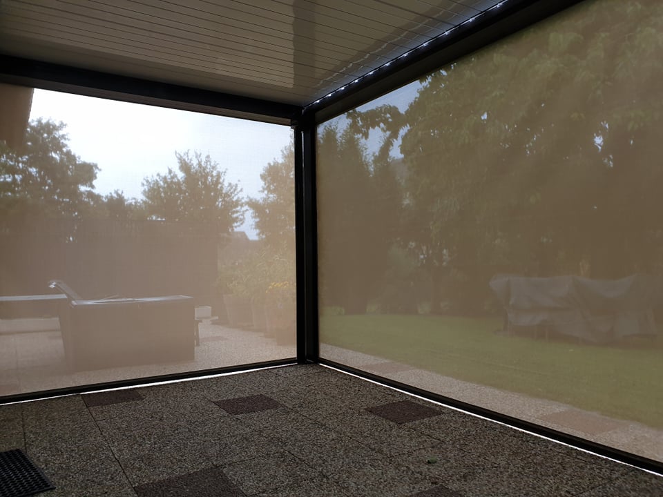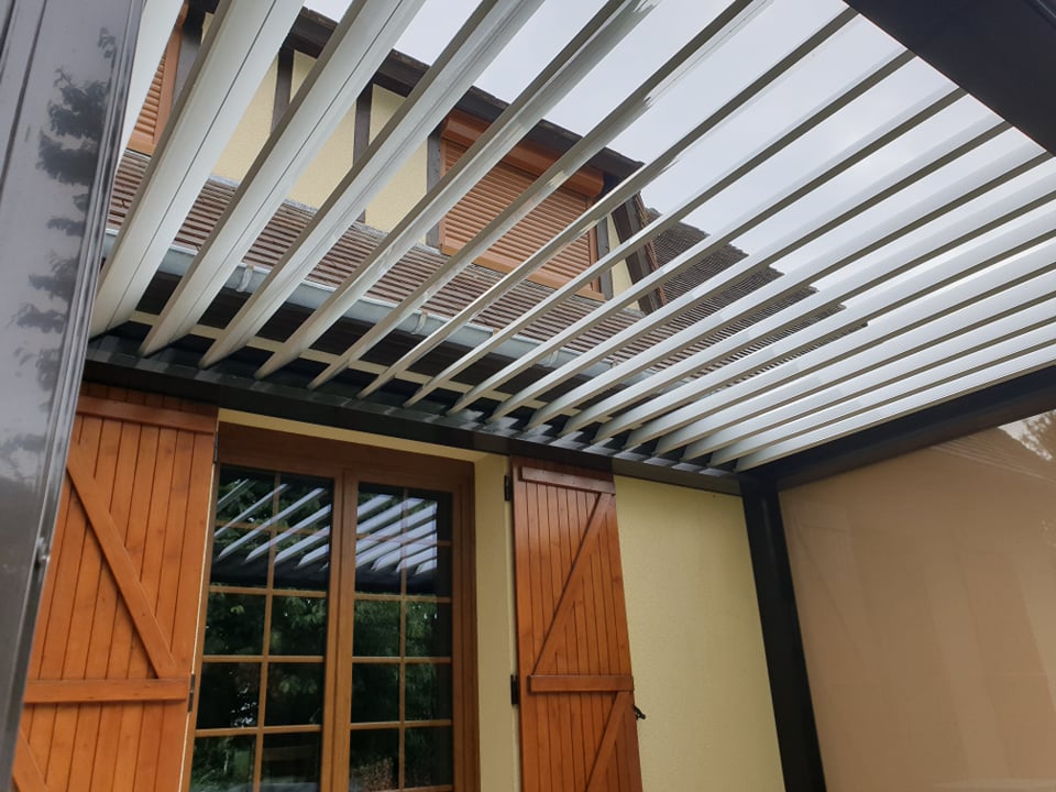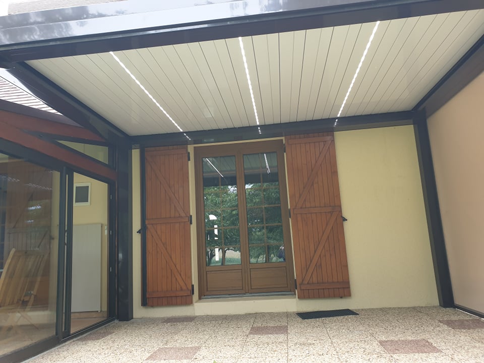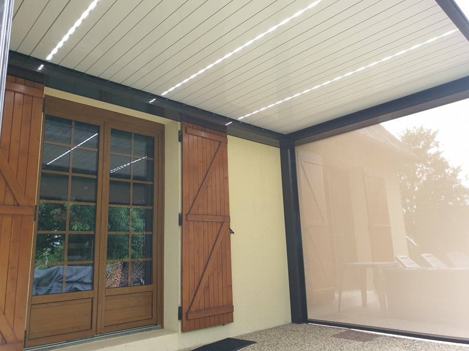 Pergola bioclimatique ral 8019 brun, store zip brun clair, trois rampes de leds. Secteur Pont de Bretonne.
